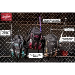 Take the field by Storm with the Rawlings Storm Girl’s T-Ball/Softball bag. Medium sized backpack for the smaller player. Features large main compartment. Front external helmet holder pocket. 2 side bat sleeves and water bottle holders.