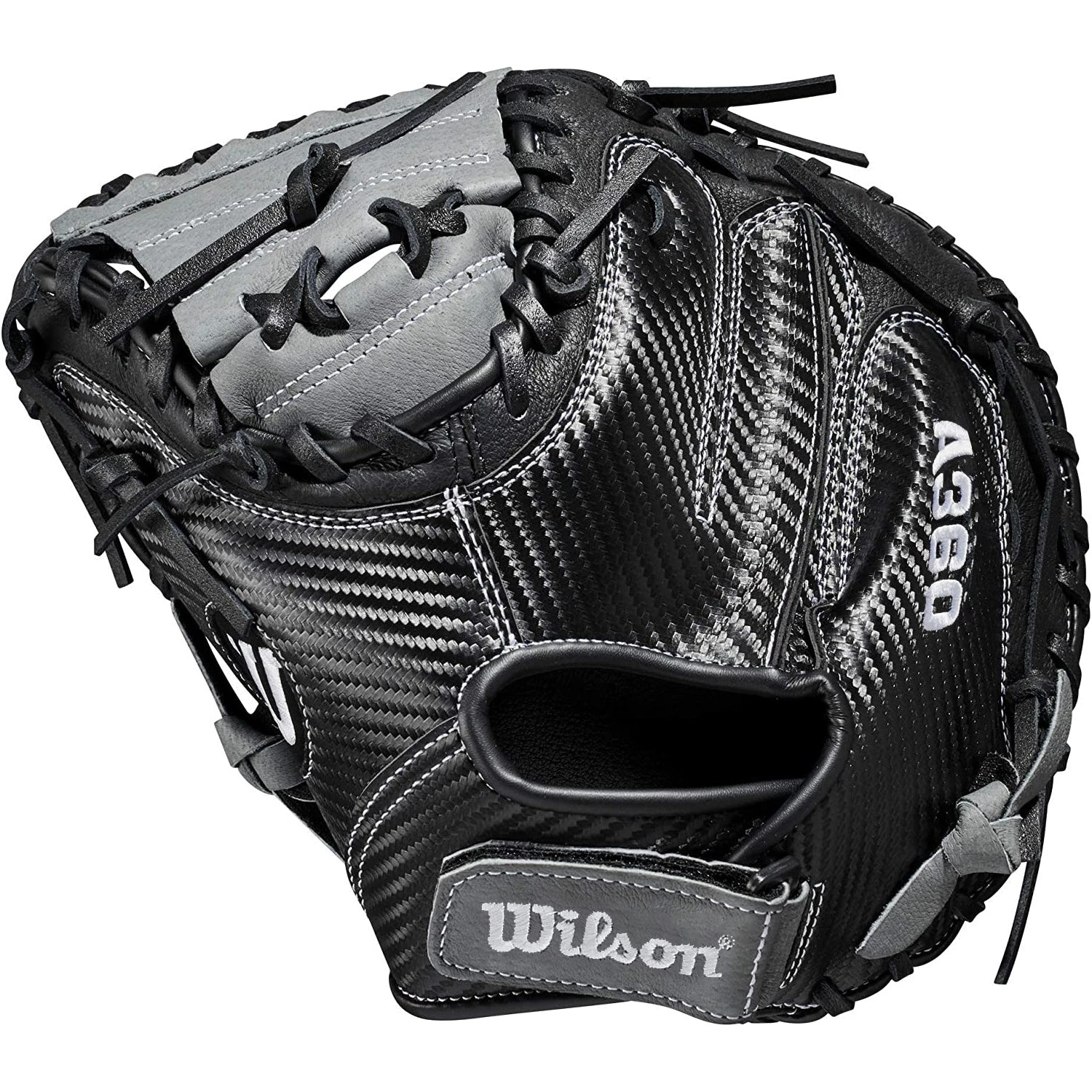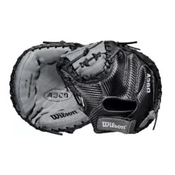 The Wilson A360 catcher’s mitt is perfect for aspiring young players. It’s crafted from top-quality leather in black/grey with a CarbonLite Shell for lightweight durability. Also features a Velcro wrist adjustment for a customized fit. Plus, the half-moon webbing delivers superior ball control and makes for an easy-to-close feel.
