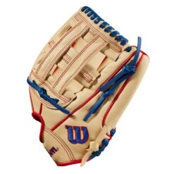 A baseball glove guaranteed to perform at any position in the diamond, this Wilson A500 12″ that features the iconic H-Web is perfect for your young all-star players. It is crafted with top-grain leather, designed with blonde, red and royal blue color scheme. It also has an open back that helps keep the gloved hand dry and responsive. Engineered for youth players, the A500 boasts a Quick Fit Wrist elastic system that adjusts to hug the wrist, and finger stalls are short and narrow for a steady control of the glove fit for kids with smaller hands